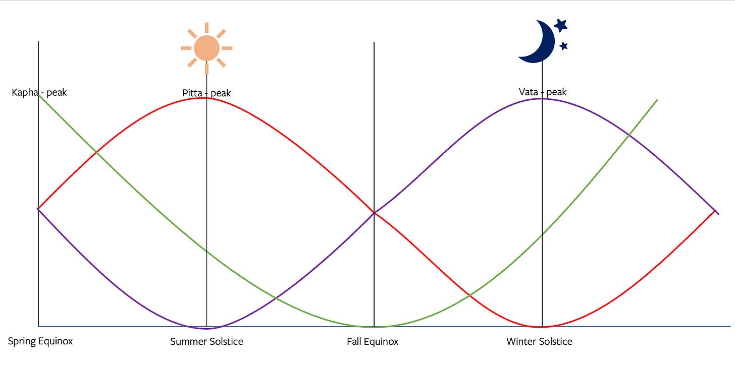 The summer solstice is a kind of apex of that faith—our bodies are revved up, juiced up, warmed up, ready to LIVE in the form of summer adventures. We feel jivana, vitality, in the form of rakta dhatu, the tissue layer of blood that courses throughout our entire body all the time, but perhaps even more obviously in warmer temperatures. But as the sun shines with all its might, we’re also given a chance to confront—to feel with all of our senses, but especially sight, the sense associated with fire—the responsibilities of jivana. What do we need to do to care for our bodies? Summer imbalances are the most obvious of all—from sunburns and all varieties of skin rashes, to burn out and all varieties of emotional melt-downs (think: airports, long car rides with cranky children or cranky adults, hanger, competition for having the best/coolest/awesome-est summer plans). But it’s also very easy to be too distracted by all the fun things happening out there, our desires and ambitions to travel, read, craft, etc., and miss what’s going on in here. We might be tempted to consume life with eyes that are bigger than our stomach’s true digestive capacity.