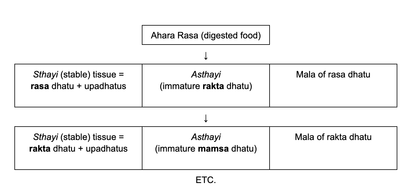We see the simultaneity of these laws playing out when we break down how the individual dhatus are formed and then inform each others’ creation and health. As I mentioned above, the dhatus go through a life cycle of maturation, producing more and less refined versions of themselves as they interact with agni: